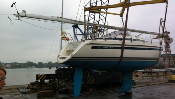 Auskranen 2014: Bei trübem, feuchtem aber noch warmem Wetter fahren wir frühmorgens von Hohe Düne nach Rostock und Blue Layla kommt heil an Land - schade, dass die Saison zu Ende ist!