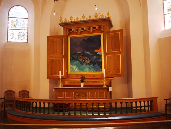 Links: Die Nikolaikirche mit dem alten (oben) und neuen Altarbild (von Sven Havsteen-Mikkelsen, links).