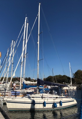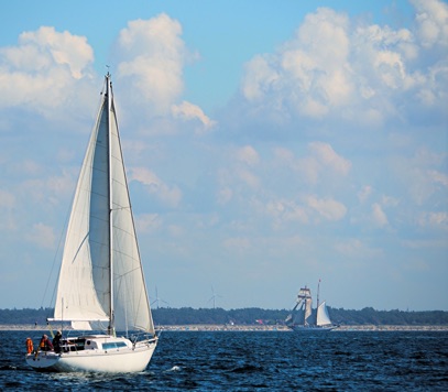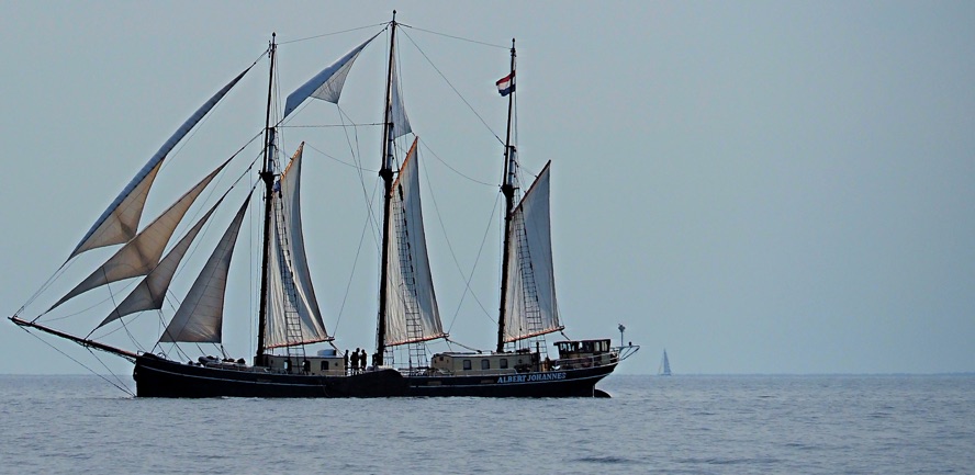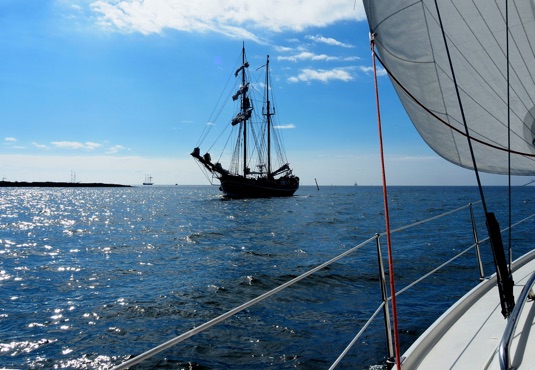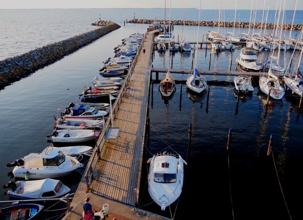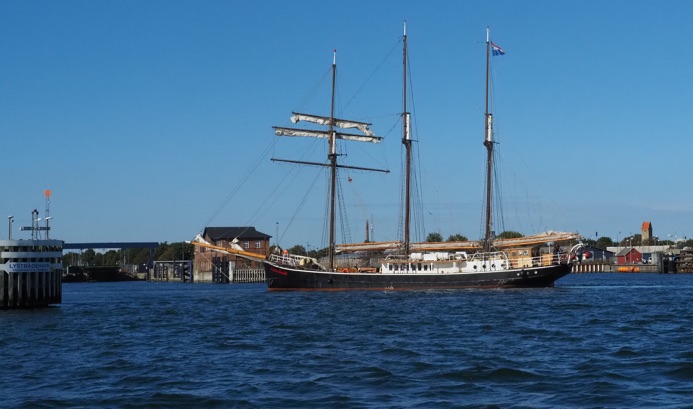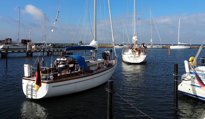 Am letzten Morgen dieses Törns besuchen uns Astrid und Jule auf Falster und erleben noch das Abschleppmanöver unserer Stegnachbarn (s.o.) mit, die hier mit einer defekten Wasserpumpe liegengeblieben waren und nun unter Segel zurück nach Deutschland wollen. Nach einem herrlich-gemütlichen Frühstück bahnen auch wir uns den Weg zwischen Fähren und den Hafen Gedser verlassenden Großseglern hindurch hin zur Kadetrinne – und zurück nach Hohe Düne. Jule überwacht das Ablegemanöver und behält SY Blue Layla bis zum Horizont im Blick: